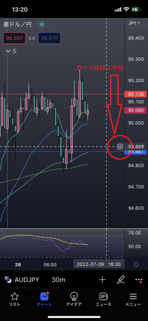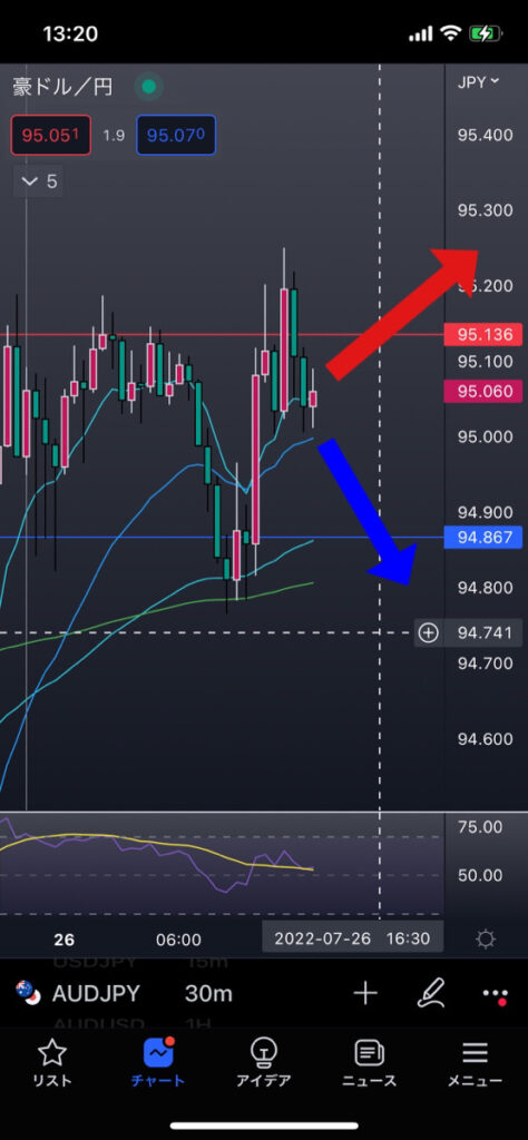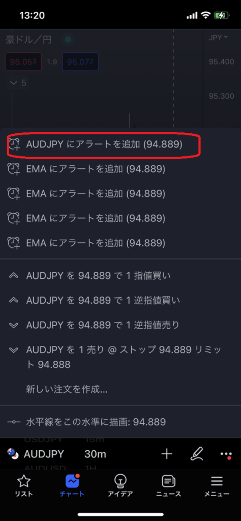 TPナビはラインを越えたところでエントリーというルールになるので、朝起きて、そろそろローソク足が越えそうな戦略ラインのすぐ下(もしくは上)にアラームをセットしておきます。