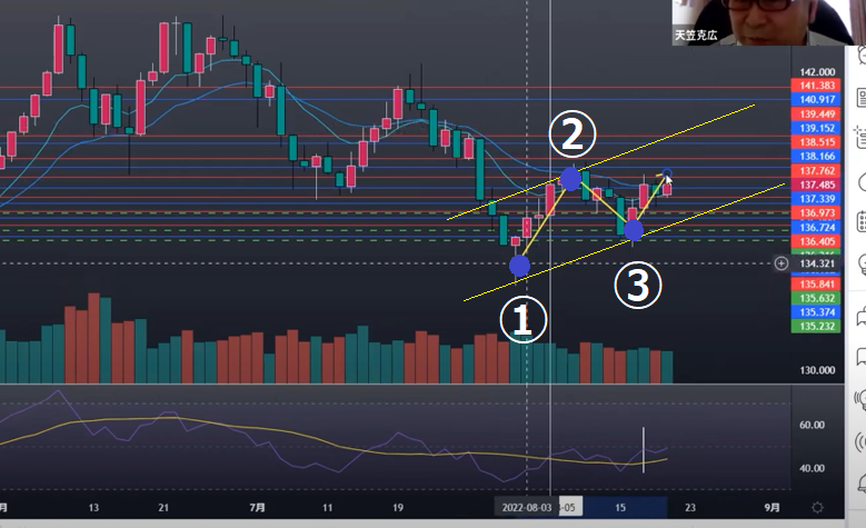 しかし、この相場は形成中なので、この先どうなるか分かりませんが、1,2,3点と出来ている状態(点をつないだ線が「N」の形になっている)ので、これを上昇中と仮定します。